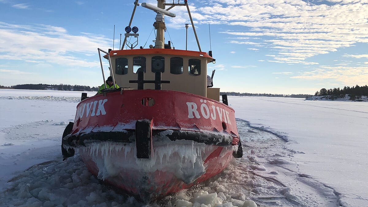 Totalt har fyra olika bogserbåtar med isbrytaregenskaper använts för att frakta material och personal till Norrbyskär, ett helt avgörande moment för att överhuvudtaget kunna genomföra entreprenaden. Vid något enstaka tillfälle har skoter kunnat användas, men isläget i havet som omger Norrbyskär har följt med naturens krafter och blivit en helt avgörande faktor att behöva förhålla sig till i arbetsplaneringen.