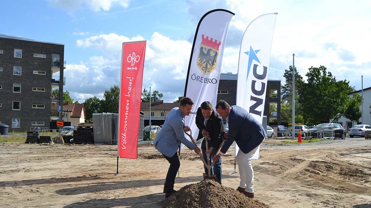 På plats under spadtaget fanns Per-Åke Sörman (C), ordförande i Programnämnd social välfärd, Ulf Rohlén, vd ÖBO och Peter Höög, avdelningschef NCC Building.