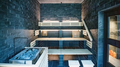 Anläggningen innehåller även omklädningsrum, duschutrymmen och cafeteria. Inredningen går i en vacker grön ton som ger en harmonisk atmosfär. Unikt med badhuset är att det inte finns någon källare på anläggningen. Istället har man valt att ha en nedsänkt teknikdel samt fläktrum på andra våningen, dold bakom en vacker fasadklocka.